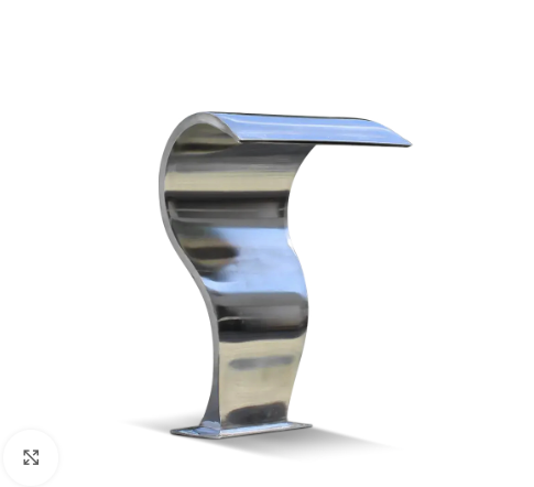 Cascada volumétrica Vulcano. Fabricada de AISI 304, pensada para ser colocada en la vereda con altura de 47 cm. Genera una lámina de agua vistosa y continua de 35 cm de ancho hasta el espejo de agua. Su terminación pulido brillante destaca y ofrece un distintivo ornamental para su piscina.